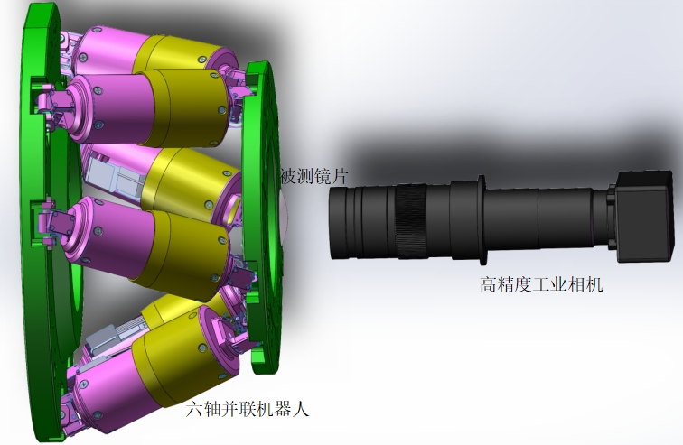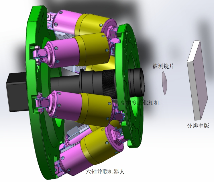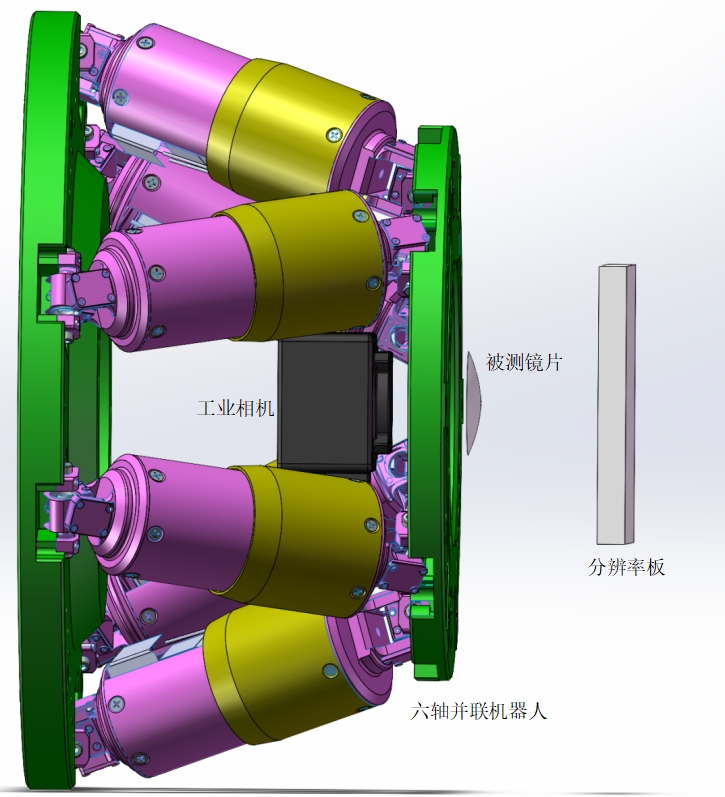 調(diào)整機構(gòu):調(diào)整工業(yè)相機、被測鏡片、分辨率測試圖案的相對機構(gòu)。在本方案中使用六軸并聯(lián)機器人來完成。