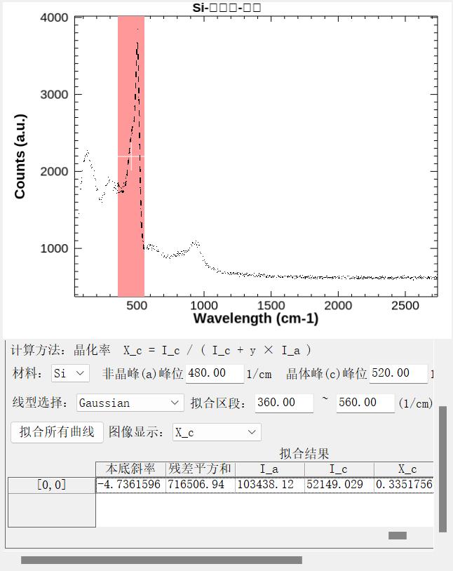 表示在520cm^-1 和480cm^-1附近的拉曼峰的面積,中心為520 cm^-1附近的拉曼峰是晶體硅的特征峰,位于480cm^-1附近的拉曼峰是非晶硅的約化聲子譜密度。