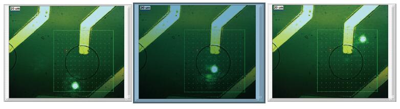 激光通過(guò)掃描透鏡,掃描振鏡,成像透鏡,由顯微鏡聚焦到樣品表面,激光激發(fā)樣品產(chǎn)生光電流,光電流信號(hào)通過(guò)探針引出至電流源表,再通過(guò)軟件在軟件中讀出。掃描時(shí),振鏡是通過(guò)電壓控制器控制光束的偏轉(zhuǎn)角度,激光的光斑在樣品的XY 方向上掃描移動(dòng), 軟件記錄每一個(gè)激光聚焦光斑的位置和其對(duì)應(yīng)的電流值,在軟件上同步描繪出光電流成像圖,顯示了樣品的電流分布。由于采用振鏡結(jié)構(gòu),光斑移動(dòng)在物鏡處是不同位置入射,而不是不同角度入射,因此可以保證入射到樣品不同位置的光斑模式不會(huì)變化