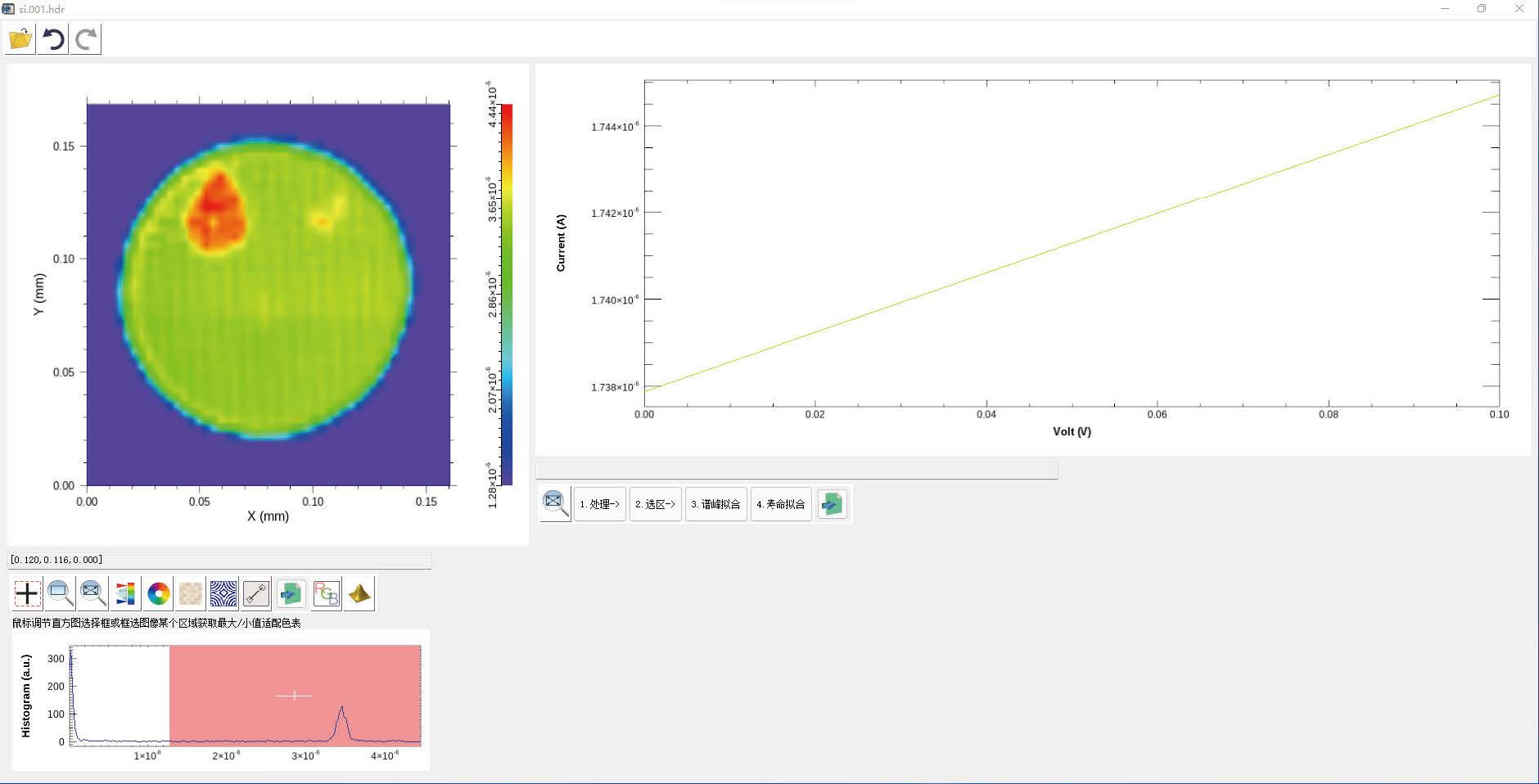 光電流掃描(Mapping):可以設(shè)定固定的電壓,逐點(diǎn)獲取電流值 I-V曲線掃描(Mapping):可以設(shè)定指定的電壓區(qū)間,逐點(diǎn)獲取I-V曲線 指定區(qū)域掃描(Mapping) |